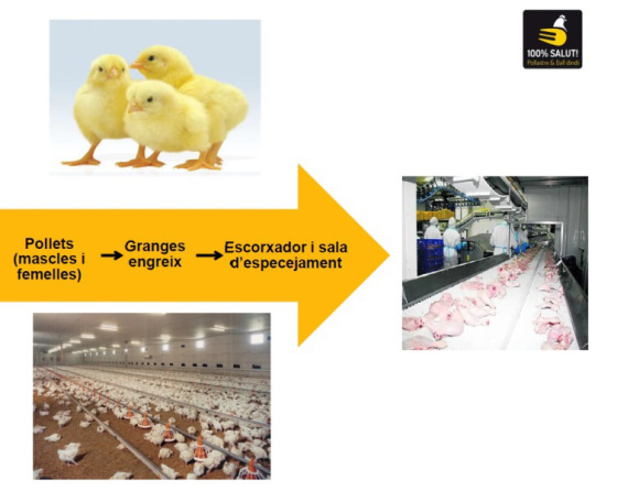 Ara bé, aquest pollet d’1 dia, d’on ve? Doncs prové d’una incubadora on l’ou s’ha estat 21 dies fins que ha eclosionat, sortint-ne el pollet. I aquest ou, d’on surt? Arriba d’unes altres granges on hi ha els pares i mares dels pollastres, en una proporció de 10 gallines per cada…