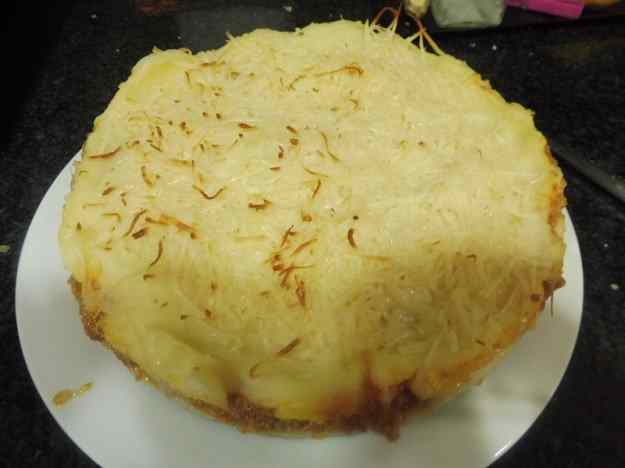 - En un motlle desmuntable untem amb mantega o spray de mantega i posem la meitat del puré de patata i al damunt el sofregit
