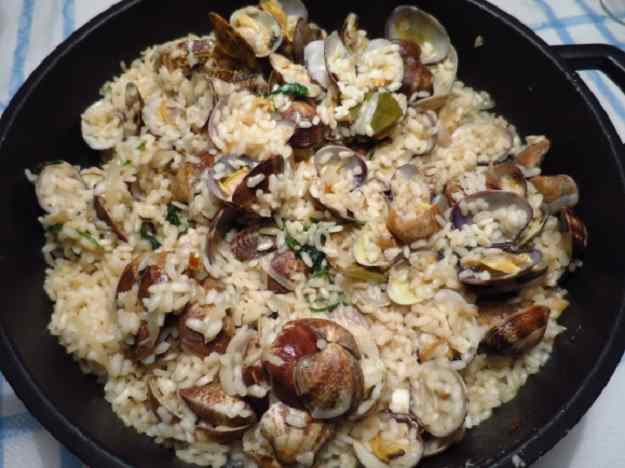 - Regueu-lo amb el caldo de les cloïsses i deixeu-lo coure durant 10 minuts, afegint-hi els alls i el julivert picats, el formatge ratllat i les cloïsses.