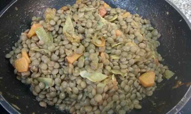 - Posem oli a la paella i la posem al foc hi afegim les carxofes, la ceba i la pastanaga i fregim una mica afegim els tomàquets i la sal i coem , afegim les llenties i coem tot junt una mica i podem servir