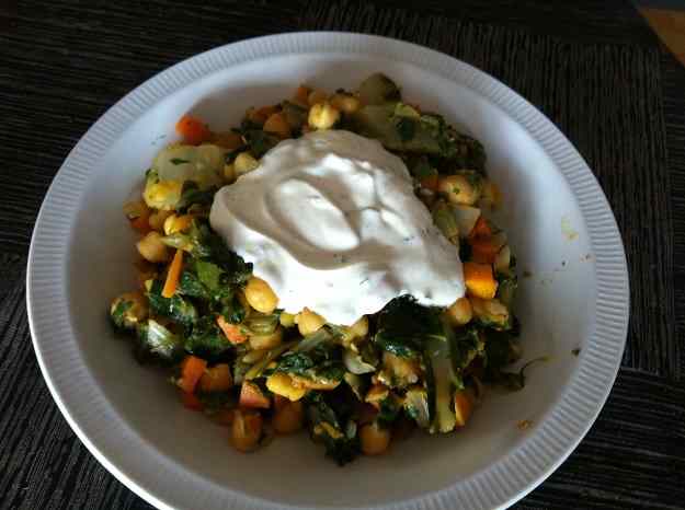 Comencem bullint les bledes, molt poca estona, i després les tallem petites. Saltegem les pastanagues amb les llavors i l´all, afegim les bledes i els cigrons, les herbes i el suc de llimona. rectifiquem de sal i pebre i retirem del foc. Quan no estigui molt calent hi afegim el iogurt i servim, afegint-hi una culleradeta més per sobre a cada plat.