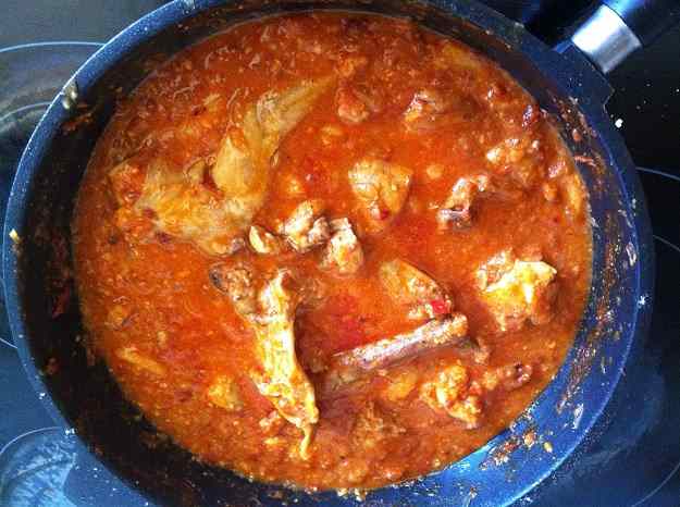 Primer de tot sofregireu la carn de les nyores, que han estat estovant-se durant una hora llarga com a mínim. De fet, com més estona estiguin remullant-se molt millor. En aquest mateix oli enrossim els trossos de conill prèviament salpebrats, els reservem i tirem a la cassola la ceba tallada ben fina i en pocs minuts el tomàquet, tallat a daus, sense pell ni llavors, juntament amb les herbes. Quan agafi la pinta de sofregit tornem a posar hi el conill, afegim una cullerada de farina i el vas de vi (si no teniu negre a mà, doncs blanc també va bé), deixem reduïr i ho mullem amb aigua o brou blanc fins a cobrir-ho. Deixem coure a poc a poc mentre fem la super picada amb la carn de les nyores, els alls, les avellanes, una llesca de pa fregit i si voleu el fetge del conill, i després enrossim les patates tallades a rodelles, ni molt gruixudes ni molt primes. Tirem les patates a la cassola i tot seguit la picada. Es pot tirar la picada havent enretirat el conill, colat la salsa, i llavors posar de nou el conill amb la salsa colada i les patates…Jo crec que no cal, queda genial tot el conjunt acabant-se de coure, sense colar ni res, amb un sabor espectacular, un plaer pels amants d´aquest tipus de guisats, de veritat.