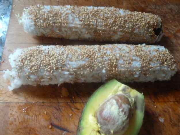 - Anem posant l’arròs a sobre de l’alga en una capa, estirant-lo amb els dits humits, deixant un espai als laterals, perquè al enrotllar-lo no surti l’arròs pel costats. Posem per sobre de l’arròs les llavors de sèsam torrat i amb molta cura li donem la volta de manera que l’arròs quedi en contacte al film i l’alga nori a dalt.