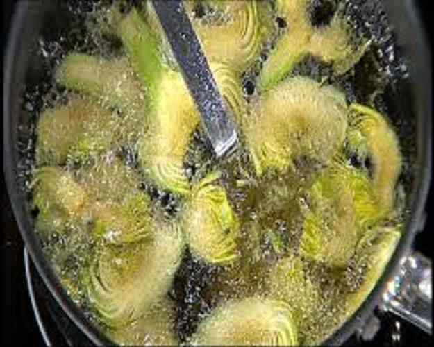 - Escórre-les i talla-les en rodanxes ben fines, afegeix sal, enfarina-les i fregeix en abundant oli fins que quedin ben cruixents. Conforme les vagis traient, deixa-les escórrer sobre un paper absorvent.