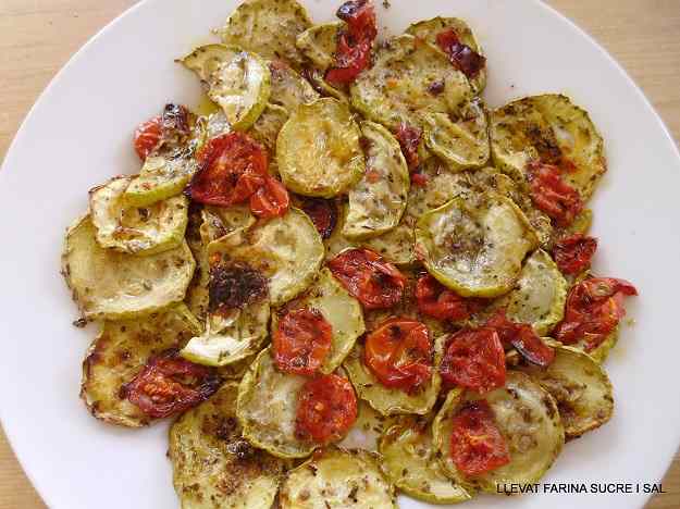 - En un bol barregem els carbassons els tomàquets, l’orenga la sajolida, la sal i l’oli, ho remenem i ho posem al damunt del paper del forn,els escampem ben planets i els enfornem uns 25 minuts, si veiem que encara els hi falta una miqueta de cocció, els deixem uns minuts més.