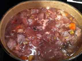 Quan estiguin les posem a la cassola on tenim la carn i en la cassola on hem saltejat carn i verdures hi posem el vi de la maceració, deixant-lo que arrenqui el bull, retirant totes les impureses i deixant que bulli cinc minuts. Passat aquest temps el posem a la cassola on tenim la carn i les verdures i deixem que faci la xup xup un parell d´hores aprox, fins que redueixi força el vi. A continuació afegim el brou de carn i deixem que es vagi coent, lentament, fins que la carn estigui…uff…això poden ser tranquilament quatre o cinc hores, potser més.