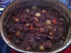 Bé, el que segons la recepta havia d´haver fet quan el guisat estava llest en la seva primera fase era separar la carn de les verdures i passar pel colador xinès tot el brou de la cocció amb les verdures en qüestió. El que passa és que vaig dubtar molt ja que part de la carn estava desfeta, i no tenia clar a on havia d´anar aquesta carn, si amb la resta dels talls de carn o amb les verdures, vaja, al xinès. I vaig optar pel que he explicat, vaja, no separar-ho. Si ho hagués fet el següent pas hagués estat fer una mena de “roux” amb el llard que em quedava (la carn, al principi, la salteges amb llard) i a continuació tirar-hi tot el líquid que hagués obtingut amb el colador xinès. I a continuació afegir la carn i deixar que fes la xup xup una estona més, moment on incorporaria les cebes, els xampinyons i la cansalada. Crec que la propera vegada que faci aquesta recepta, que la faré, serà fent també aquest darrer pas. I, sobretot, fer-la amb més temps!