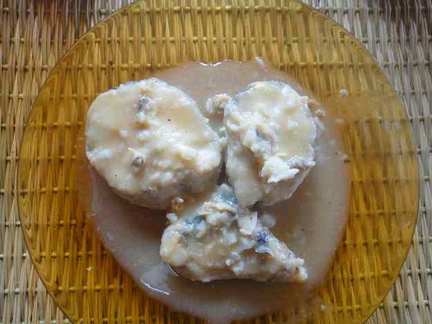 - En una paella sofregir la ceba i l´all, afegir-hi una cullerada de farina, el vi i l´aigua de coure les xirles. Es deixa coure uns deu minuts, es passa primer pel minipimer i tot seguit pel xinès i amb aquesta salsa s´acaben de coure les rondanxes de lluç amb les xirles que teniem reservades en una cassola de fang durant uns cinc minuts.