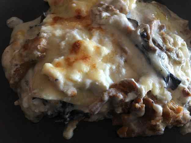 Posareu primer a estovar els ceps i començareu a poxar la xalota amb els 40 gr de mantega. Netegeu els bolets frescos i els saltegeu amb l´all i les herbes. reserveu. Afegiu la mantega a la cassola i feu un roux, tot seguit mulleu a parts més o menys iguals, a ull, amb llet i l´aigua dels ceps (colada). Quan tingueu la beixamel a punt la reserveu calenta. En un bol barregeu un ou, la ricotta, tres cullerades de la beixamel i el formatge feta. Ratlleu el formatge fontina. Bulliu les plaques de lassanya i mentrestant barregeu l´emmental (o gruyere) ratllat amb la beixamel. I quan tingueu la pasta cuita ja podeu començar a muntar la lassanya: una mica de beixamel, una placa de pasta, una capa de bolets, una de formatge fontina i una de la barreja de ricotta…una placa de pasta, etc. A mi, amb quatre plaques de lassanya en vaig tenir prou, tres pisos i llestos. Sis racions correctes, amb una amanida verda abans, i aneu més que sobrats, és molt contundent…potser massa i tot, malgrat estar absolutament espectacular. Ais, se m´oblidava, al final poseu la darrera placa de pasta, una miqueta més de beixamel i parmesà ratllat. Al forn uns deu minuts i després gratinador fins que estigui torradet. Jo, la propera vegada, prescindiré de la capa de ricotta…a veure com queda…