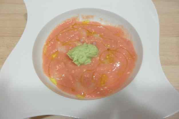 - Col-loquem una mica d’alvovat al centre del plat, i unes gambes, cobrim amb la sopa de tomàquet i per sobre un raig d’oli d’oliva.