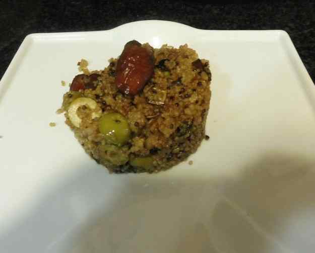 - Piqueu mitja ceba, amb una de petita n’hi ha prou. Poseu una paella amb oli al foc i sofregiu la ceba a foc lent. A continuació afegiu a la paella tres cullerades d’arròs integral ja cuit. La funció de l’arròs serà espessir la salsa. Si preferiu utilitzar la farina com a la recepta original de la beixamel, haureu de posar-la a la paella quan la ceba estigui daurada i deixar que agafi color sense deixar de remenar (una cullerada de farina).