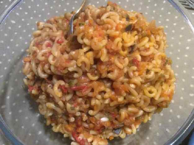 Tallem la mitja ceba a dauets petits i la posem en una paella a sofregir a foc molt lent fins que quedi rossa (transparent i marró). Afegim la carn de l’albergínia. Quan estigui rossa hi posem el peix, també tallat a dauets (gambes + rap) i per agermanar-ho hi posem una mica de tomàquet triturat.