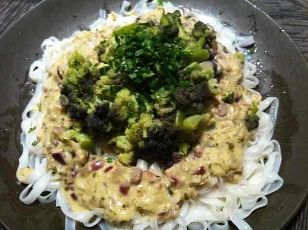 Bullir els fideus per una banda i escaldar el bròquil. Juntar-ho, barrejar-ho amb el suc de llima i l´oli de sèsam i cobrir-ho amb la salsa.