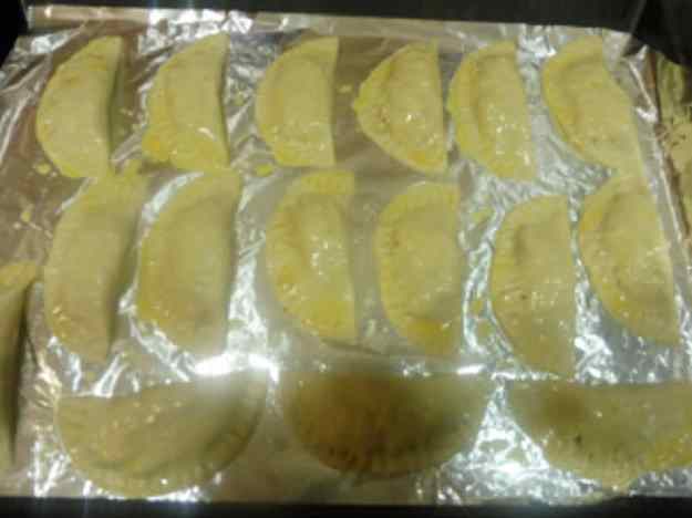 - Posem una cullerada de farcit a la cresta, pintem amb ou el voltant de la cresta i tanquem i amb una forquilla li donem la forma i aixi totes