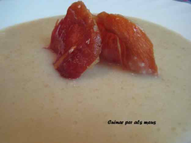 - Per acabar posem la crema en el plat i el cruixen de pernil per decorar.