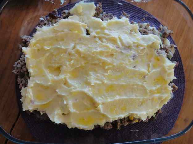 Llavors, en una safata es posa una capa de puré, desprès la carn i a sobre l´our dur, per acabar cobrint-ho amb la resta del puré. Ai, havia oblidat comentar que heu de batre l´altre ou que surt als ingredients i barrejar-lo amb el puré de patates!