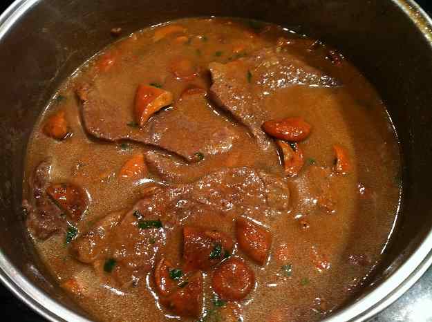 Salpebrem els bistecs (ni prims ni gruixuts…), els enfarinem i els fem en una cassola. Els retirem quan estiguin rossos i en el mateix oli fem el sofregit de ceba, pastanaga i tomàquet (tirat a l´olla en aquest ordre, els tomàquets pelats i sense llavors). Quan el tenim en el seu punt hi tirem l´anís, els grans de pebre i els claus (la fulla de llorer es tira al principi, amb la ceba i la pastanaga). Tornem a posar la carn a l´olla quan hagi reduit l´aiguardent, mullem amb el brou (que ho cobreixi, res més) i deixem coure a foc lent/mitjà durant una mitja hora.