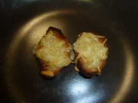 - Mentre es fa la sopa, en una safata de forn col·locarem 8 llesques de pa, tirarem una mica d’oli per sobre i repartim una mica de formatge Gruyère ratllat, posem a gratinar.