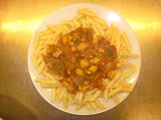 - Posem a bullir la pasta i mentrestant en una paella amb oli calent daurem la coliflor ratllada amb ratllador gruixut o talladeta ben petita. Quan comenci a daurar-se hi afegim la pastanaga ratllada fineta, ho deixem al foc uns minuts, podem afegir-hi una mica de salsa de soja i vi blanc i un cop reduït hi afegim la salsa de tomàquet i removem i deixem a foc lent durant uns minuts.