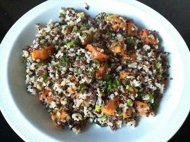 Mentre fem els boniatos al forn, pelats i tallats a daus, amb un raig d´oli, bullim els arrossos, junts. Fem el mateix amb la quinoa. Quan estiguin (arrossos uns 25 minuts, quinoa la meitat) els passem per aigua freda i els estirem en una safata.