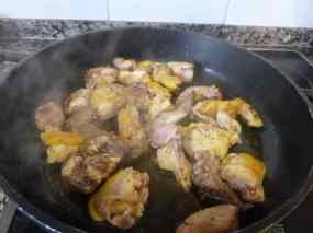 - Posem en una cassola de ferro amb oli la costella de porc, el conill i el pollastre tallat a trossos. Esperem uns 15 minuts i afegim la botifarra talladeta a trossos. Salpebrem i deixen enrossir, fins que agafin un color durat.