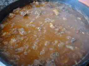 - Quant es feta la carn la retirem i al mateix oli posem la ceba ratllada, salem i deixem fer a foc lent durant 20 minuts. Afegim el pebrot tallat a trossos i els 3 dents d’alls i deixem fer durant ½ hora mes.