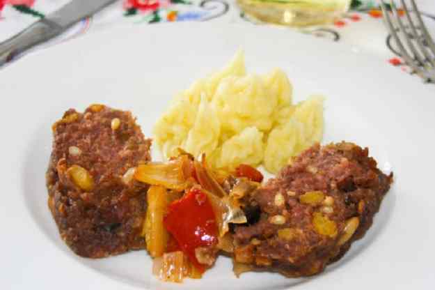 - Tallem les orellanes i les prunes a daus petits, i les barregen amb la carn, la ceba sofregida, l’ou, el pa (mullat amb la llet), sal i pebre fen una pilota allargada en forma de rodó.