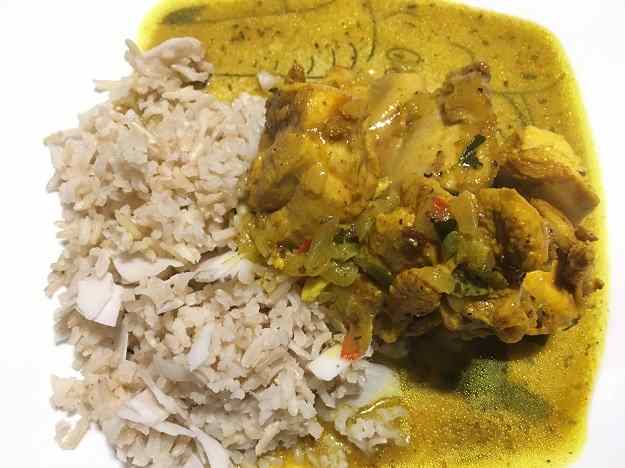 I finalment farem el curry de pollastre pròpiament dit, sofregint primer una ceba i l´all, i tot seguit els trossos de pollastre. Una vegada ben marcats es mullen amb el brou, es tapa i es deixa coure una mitja horeta a foc lent.