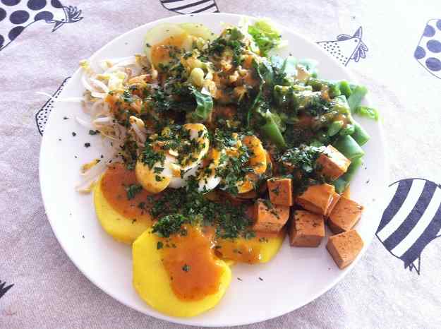 A veure, la cosa queda mooolt simplificada si comprem la salsa feta, i com que així ho vaig fer jo, així ho explico, tampoc és qüestió de complicar-nos la vida…L´únic llavors que heu de fer és bullir les patates i els ous, escaldar la soja i la mongeta tendra (deixar-la al dente) i saltejar el tofu. Posar-ho tot junt amb una mica de gràcia al plat i la salsa satay per sobre. Boooníssim!!!