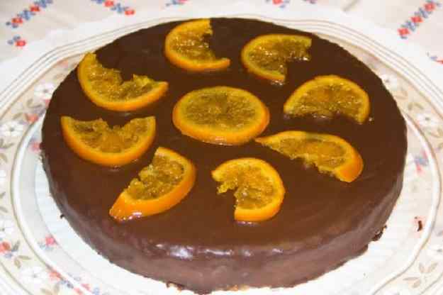 - Preparem la cobertura portant a l’ebullició la nata líquida, afegim la xocolata fins que es desfaci i remenem fins obtenir una crema fina. Cobrim el pastís i decorem (amb taronja confitada p.e.).