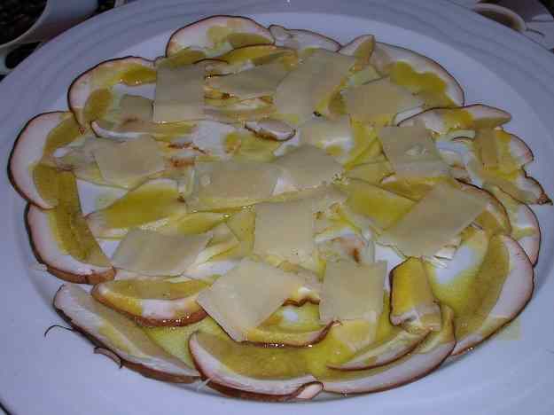 - Cobrir un plat amb làmines fines de cep. Per sobre afegir una salsa feta amb una cullerada de suc de llimona, tres cullerades d’oli, una culleradeta de mostassa anglesa, sal i pebre negre. Acabar amb formatge parmesà.