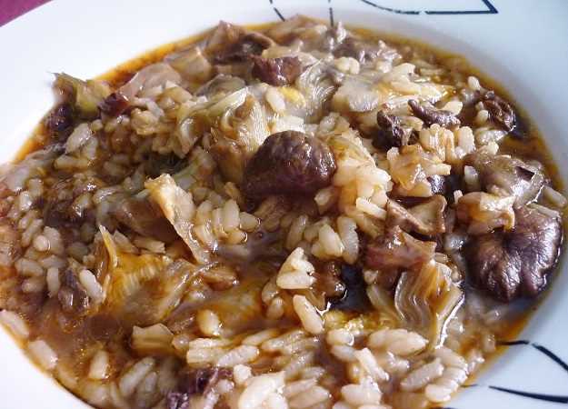 - En una cassola de fang sofregim la ceba trinxada petita, quan estigui quasi cuita afegim les carxofes tallades fines, donem unes voltes i incorporem els bolets.