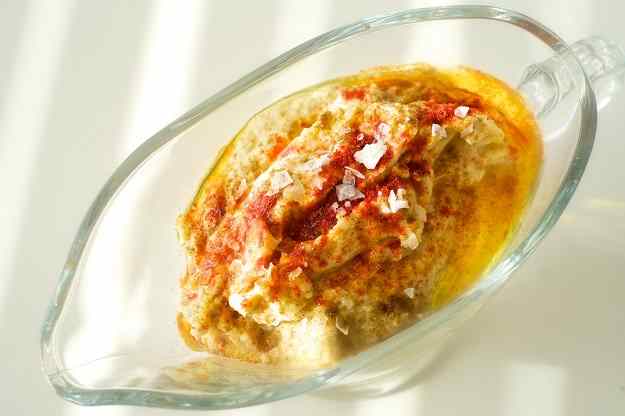 - Servim l’hummus espolsant comí i pebre vermell pel damunt amb un fil d’oli d’oliva.