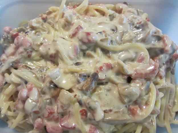 - Tornar a posar els espaguetis a l’olla, a foc molt baix, i afegir la ceba amb el bacó i els xampinyons, el formatge i la crema fraîche o la nata.
