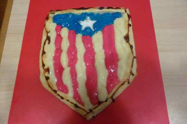- Per fer l’estrella jo le fet amb sucre glas, despues al voltant de l’estrella i he posat la crema amb el colorant blau,i despues per les barres amb la crema del colorant vermell i i la crema normal i per acabar al voltan una mica de sucre liquid.