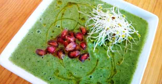 Bullint al dente només la part més exterior del bròcoli, les flors granulades i les branques més immediates, aquesta crema combina el sabor potent del bròcoli amb la dolçor de la poma. Grans de magrana i germinats d’alfals com a complement.