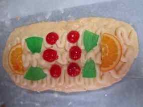 - La pinto amb llet o ou batut i la decoro amb pinyons, fruita confitada i sucre.