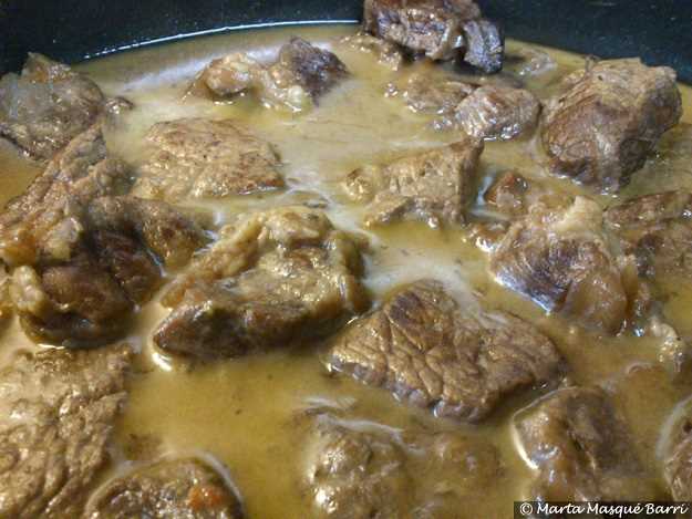 - Al cap d’una estoneta, quan ja s’hagi evaporat l’alcohol i hagi reduït, afegiu-hi l’aigua o el brou (calent millor) que ho cobreixi.