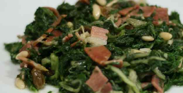 - Quan es comenci a daurar el pernil, li afegim les panses i els pinyons, deixem que es socarrimin una mica i ja li podem afegir els espinacs.
