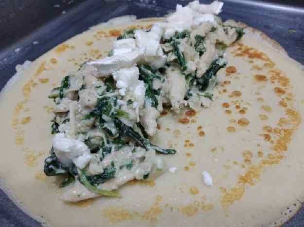 - Posarem dues cullerades de farcit en cada crep i hi escampem una mica de formatge de cabra pel damunt.