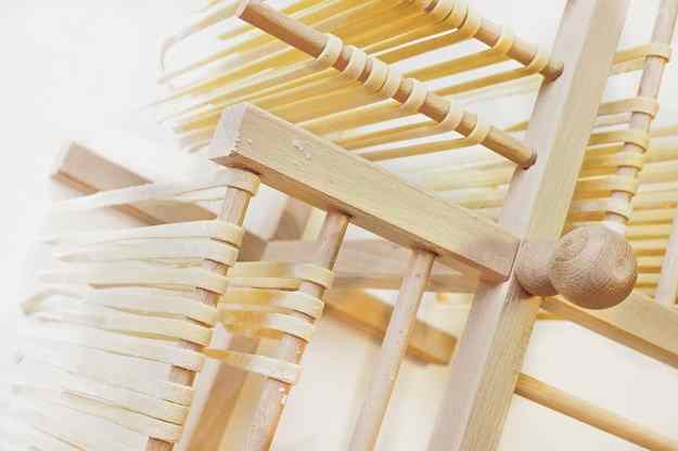 Recollim els espaguetis o tallarines per assecar-los. Ho podem fer en un assecador de fusta, sobre una canya, o fins i tot en l’estenedor de casa!