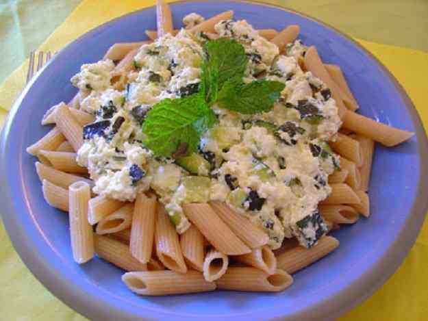 - Quan estigui cuit ho retirem del foc i hi afegim la menta ben talladeta i el mató esmicolat; ho barregem bé i ho posem damunt la pasta quan la tinguem al dente i ho empolvorem amb un polsim de parma i un raig d’oli.