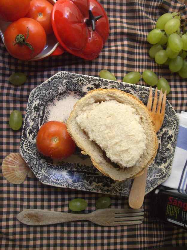 - Prepareu el pa, per a fer-ho el dividiu en dues meitats, després n’agafeu una i la buideu per la part de la molla tot fent un forat en forma de falca de manera que tota la molla us surti en un sol tros.