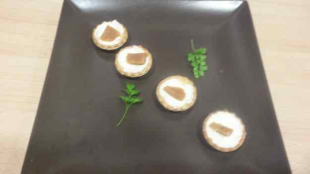 - Posem una culleredeta de mascarpone a cada tartaleta,despues i posem una tira de salmó enrotllada formant una rosa i despues unes nous.