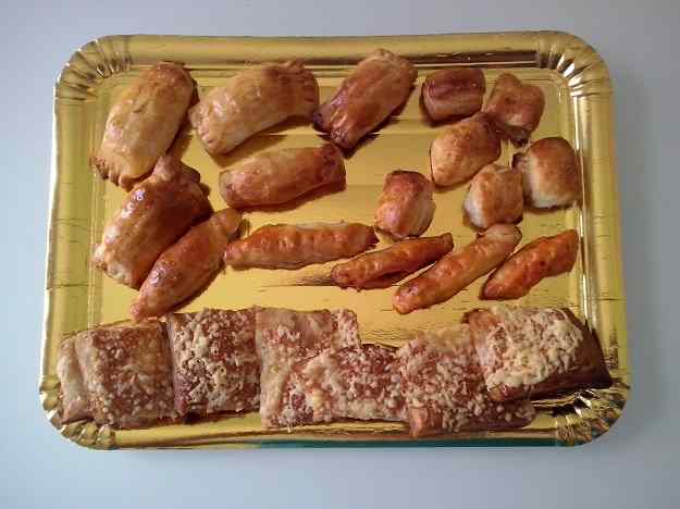 - Talla petits rectangles de pasta de full, al mig hi vas posant el farciment que vulguis i ho tanques com si fos un regalet. Ho pintes amb ou batut,