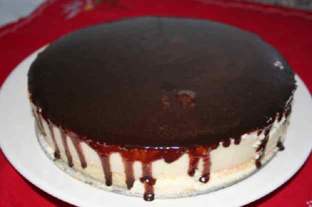 Per la cobertura de xocolata, posem un caço al foc amb l’aigua, la nata i el sucre, ho portem a l’ebullició, ho traiem del foc i afegim el cacau fins que es dissolgui bé. Una vegada dissolt ho passem per la batedora, afegim els fulls de gelatina (prèviament hidratats) i ho col·lem. Ho posem a la nevera (6h. Aprox.). Passat aquest temps ja podem escalfar la glaça al microones (40 graus aprox.) i estendre una capa sobre el mousse.