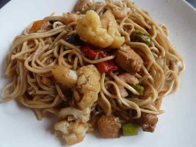 - Quant han passat uns 5 o 6 minuts, veurem que les verdures tenen un aspecte cruixent, afegim el pollastre i els fideus, tirem unes tres cullerades del aigua de bullir els fideus, donem unes voltes, afegim les gambes i la soja.