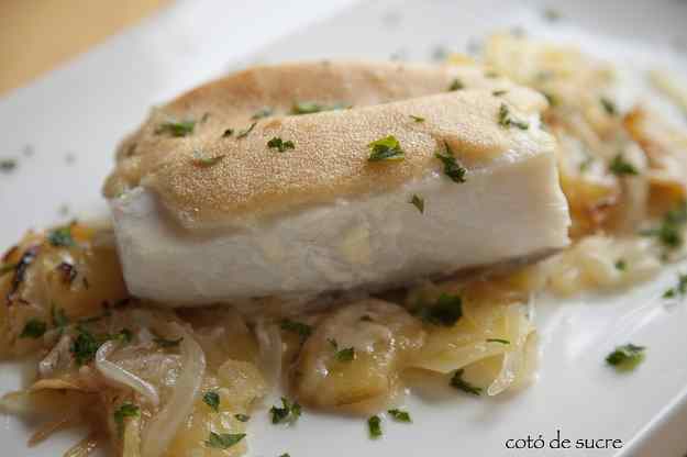 - Al damunt s’hi posen els talls de bacallà ben escorreguts i eixuts de l’aigua del remull.