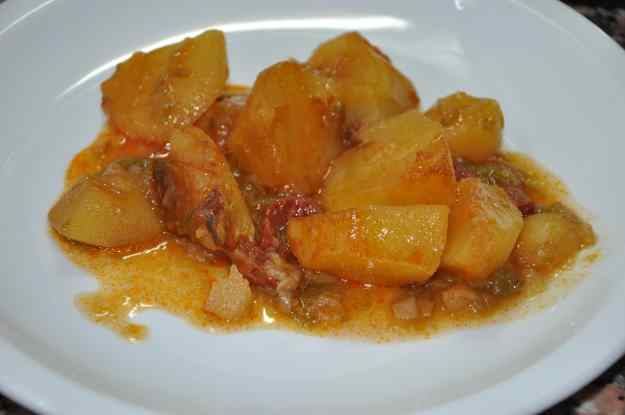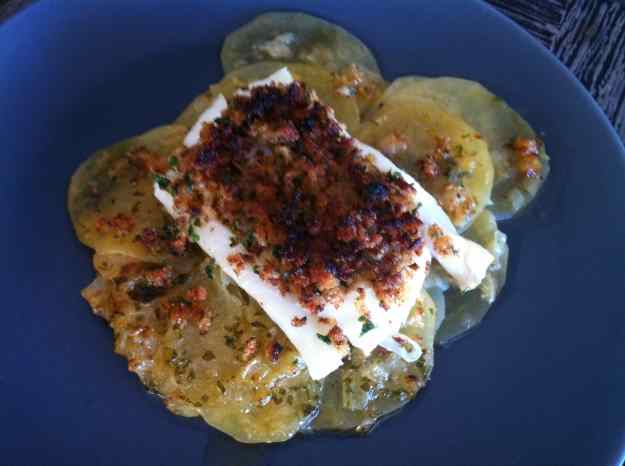 Una vegada tenim el brou i el sofregit tallarem amb la mandolina les patates, uns 2 mm de gruixut, i les barrejarem amb el sofregit i una mica de pebre de cayena. Mullarem amb el brou i ho posarem al forn, tapat, fins que s´hagi evaporat tot el líquid.