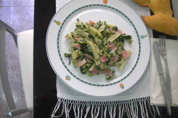 - Barregeu el pernil i els ous amb la bleda fins que l’ou hagi quallat.
